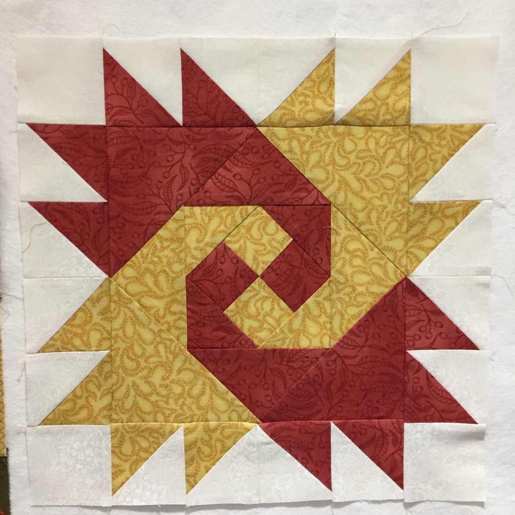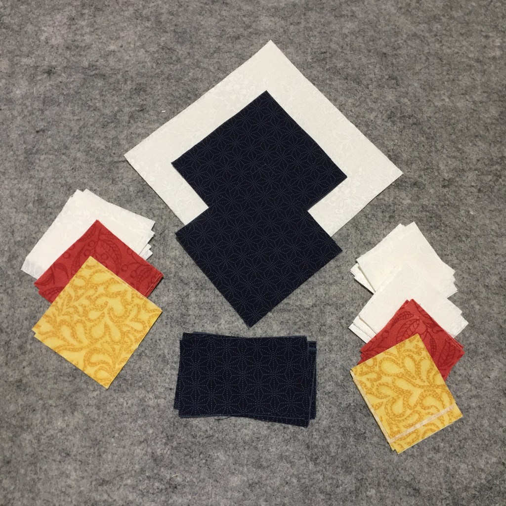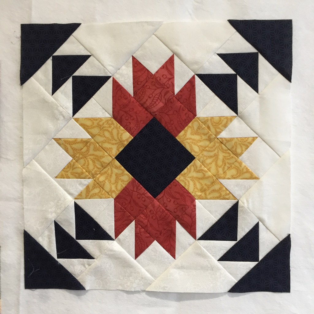 Now it’s time to get back to work. It’s been a few weeks since I last looked at the block swap blocks, and in the meantime we have had a new member to the group. Linda has joined us all the way from Spain and we are looking forward to her joining the meeting this weekend. When I looked through my stash yesterday, to find fabric for her blocks, I realised that the picture Linda sent appears to be of a primary colour scheme. I have kept the fabric choices quite muted but couldn’t resist adding a deep blue in a sashiko print into the Tropical Bear block.