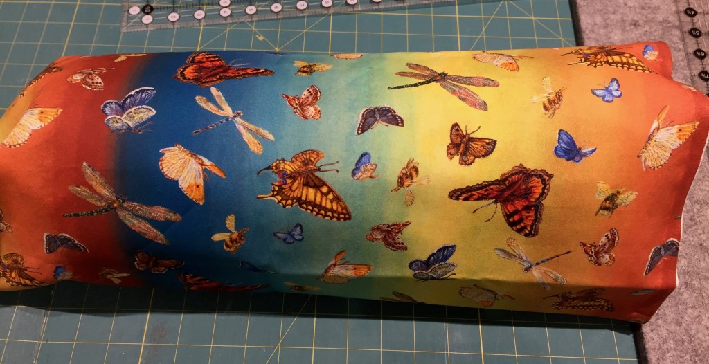Whist I was in cutting out mode I started preparing fabric for a bolster cushion for a Christmas gift. As I am using the butterfly ombre stripe fabric the hardest choice is which way round to position the stripes.