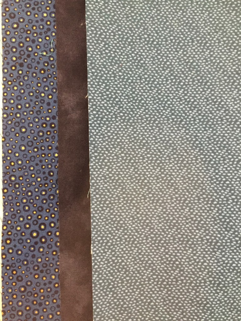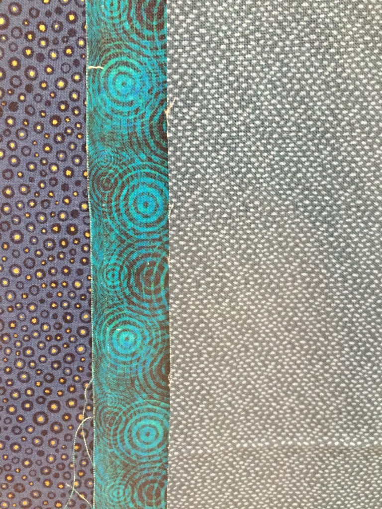 I auditioned and photographed fabric combinations to make a decision. Finally I chose the dark blue, as it will give a more subtle effect to the border than the brighter teal fabric.