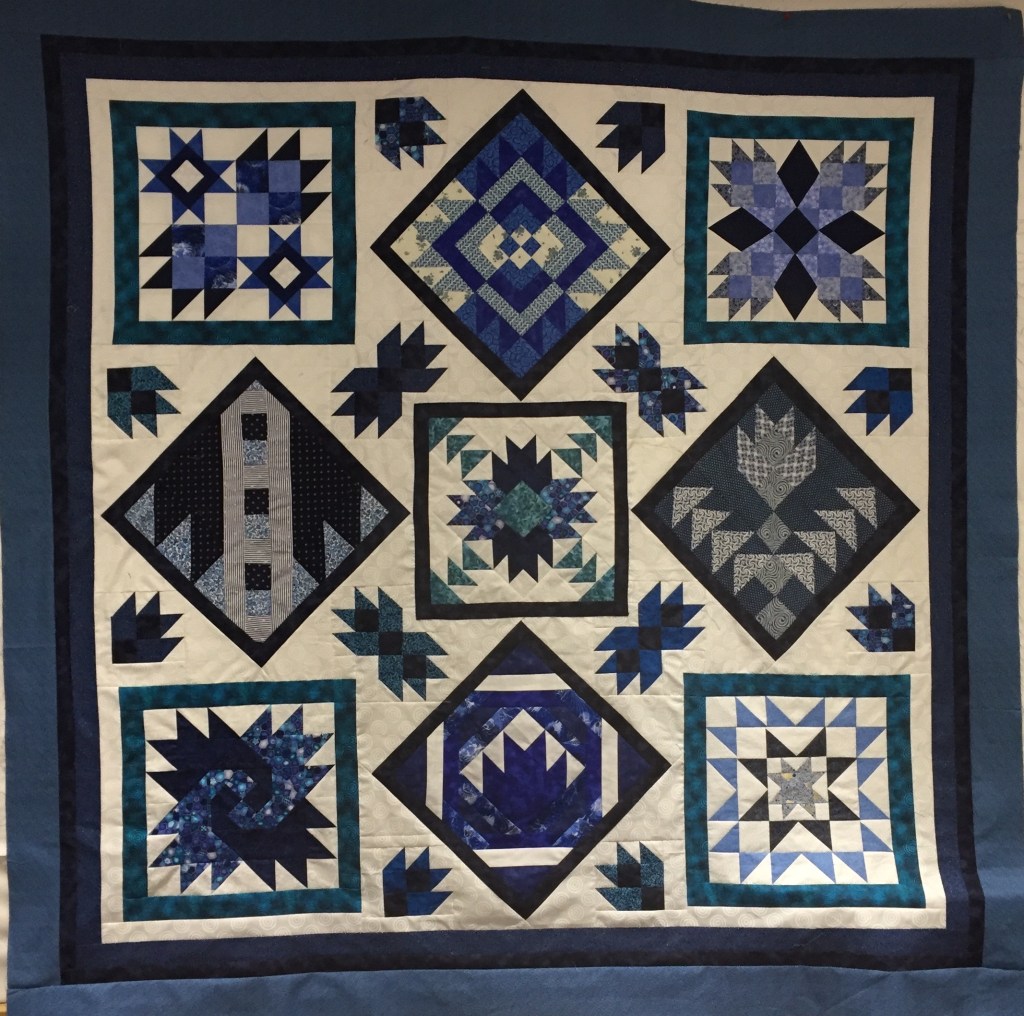 But now after all the difficulties, the piecing is complete and it is time to decide whether to add borders or not. I left the quilt top on the design wall and pondered this question for several days we. I have gone from one border to two and finally three. Then there is the choice of fabrics. The choice for middle border are between the fabrics framing the blocks on the quilt top. The dark blue are the on-point blocks and the teal fabric frames the square ones.