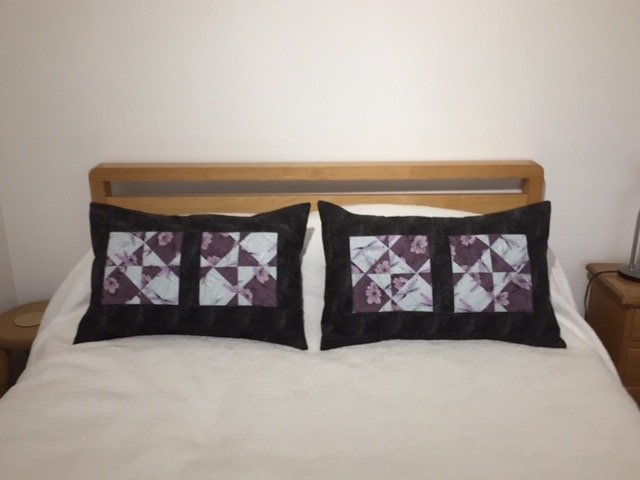 After the disappearing four patch block zoom lesson, Janet made these striking pillows. One of the most pleasurable parts of teaching is to see what is done with the techniques and patterns from the classes. The pillows are just beautiful, and look very welcoming.