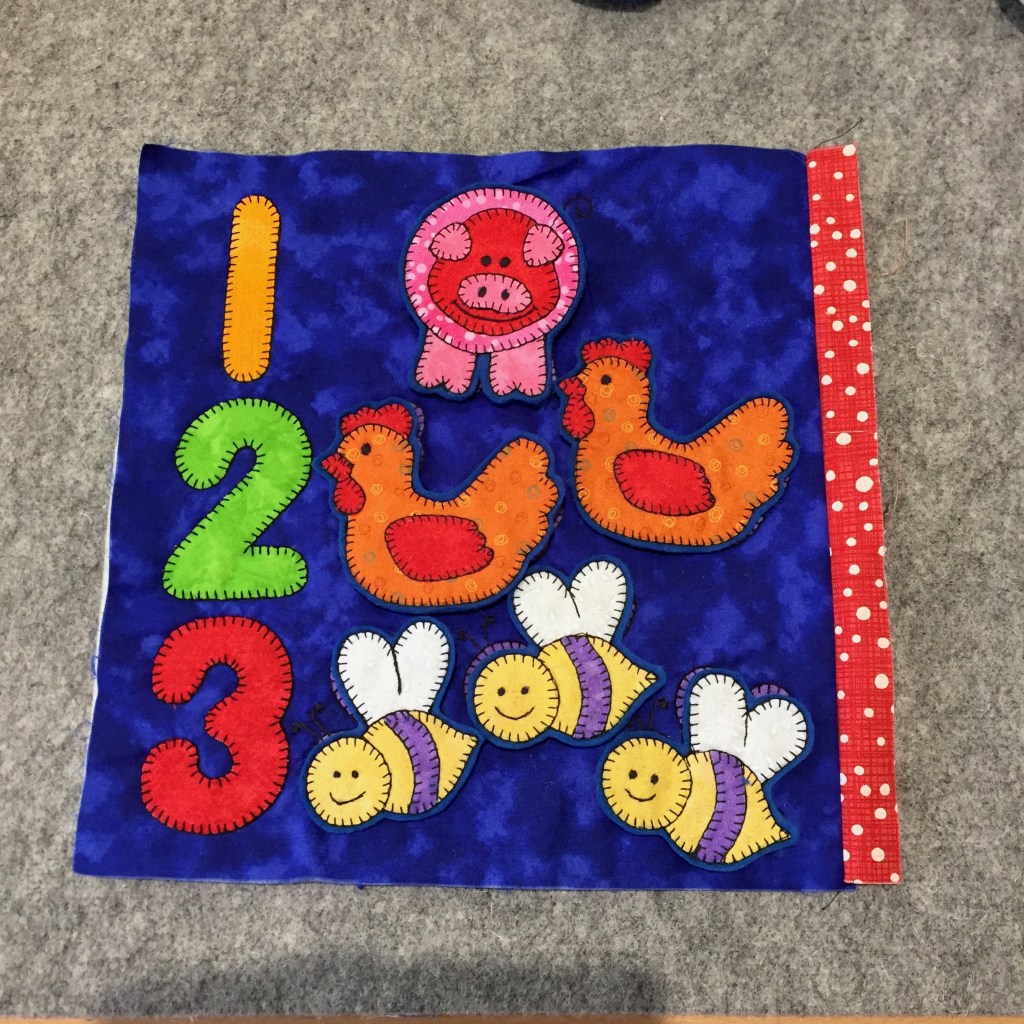 How the year has flown by. It will soon be our granddaughter, Robyn’s first birthday. I have been on a mission to complete another cloth book for her. Last year iImade the Animal Friends book by Kids Quilts for her. She enjoyed playing with it so much that I chose another of Kids Quilts patterns – Farmer Joe’s Quiet book, for her Birthday present. Yesterday it was still all in pieces but with a concerted effort it has been completed in time for the weekend.