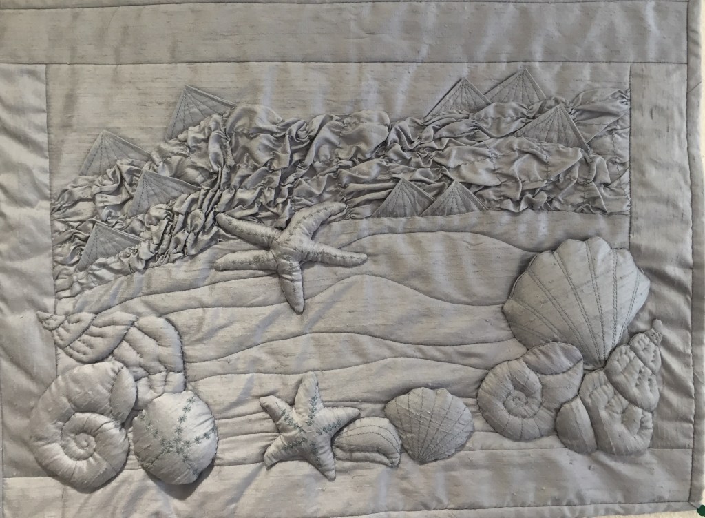 The rock pool panel, shown above, uses many of these techniques along with prairie point Limpets. Starfish and shells complete the rock pool. It was great fun creating and teaching this workshop. Looking back through the textiles I have made over, I was going to say the last 30 to 40 years, but then realised that it is over my lifetime, has made me realise how my work has changed. From designing knitting, cross stitch and blackwork patterns, Stitched paintings to teaching hand and machine embroidery and patchwork & quilting. I feel that my love of textiles has only become stronger over the years.