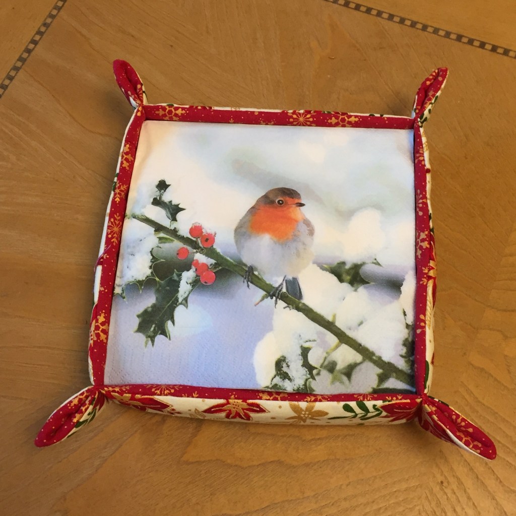 As I started late on the Christmas makes, (mid way through November) I only managed to make 5 pairs of socks, I decided to make some simpler items as stocking fillers. One was a Christmas napkin basket. I found a fabric with a robin picture which I placed in the centre of the basket as a surprise when all the napkins have been used. Although a square of Christmas fabric works just as well and is less time consuming.