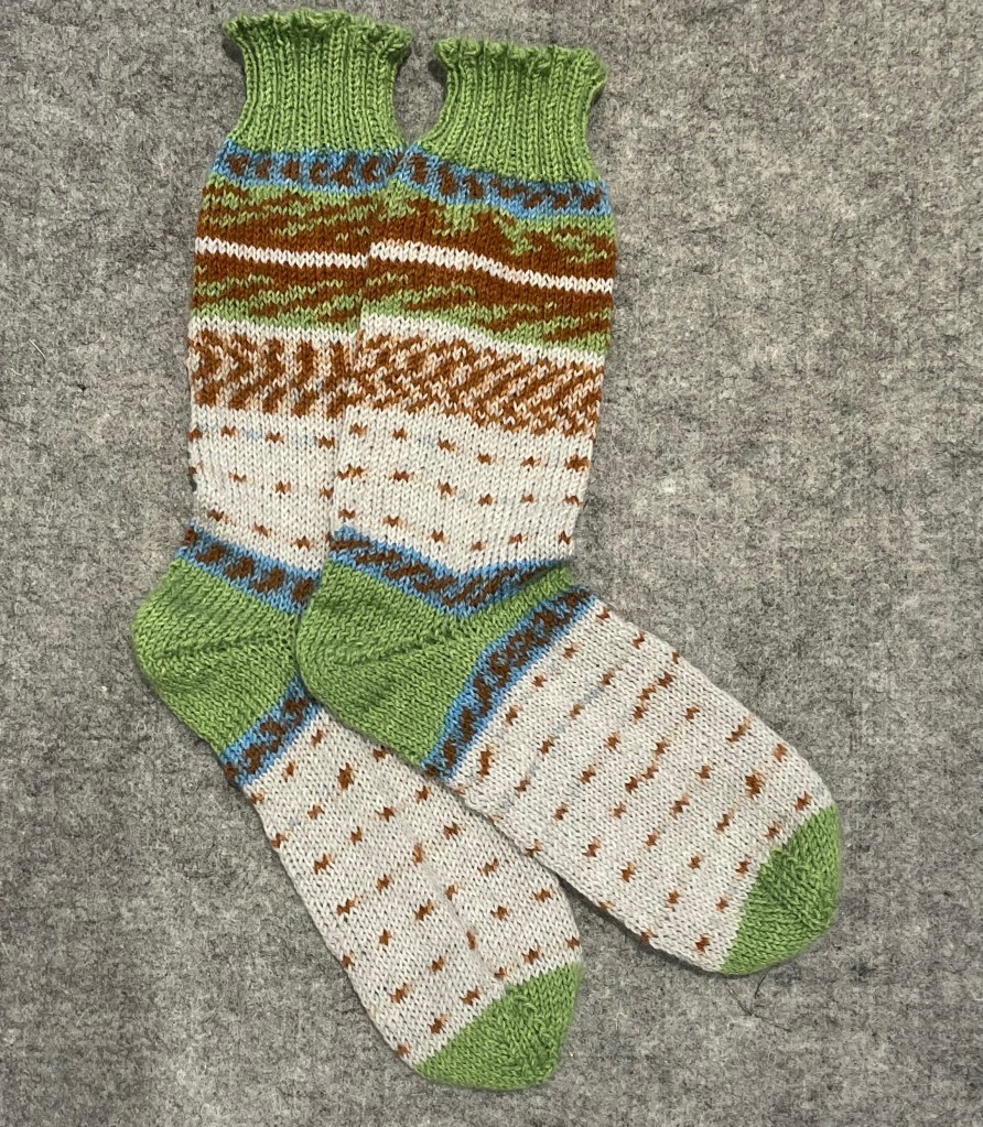 I bought some sock yarn – Perfect by Arne & Carlos for Regia – which makes a perfect pair of patterned socks with with no worry about the row count. I didn’t read the instructions though, and started from the outside of the ball of yarn. I was quite a long way down the sock and thinking this doesn’t look like the pattern before I read the instructions. Only to find that I should have started with yarn from the centre of the ball. After unravelling the sock and starting again, everything was going great until the heel turn. My usual heel turn – the Strong heel, does not work with this yarn. It has been designed for a German short row heel or a boomerang (Bumerangferse) heel. It took several attempts to make a heel that I was satisfied with, but I still find that I am getting holes. This year I will master it as starting now gives me plenty of time before Christmas. It is one of this years challenges to myself.