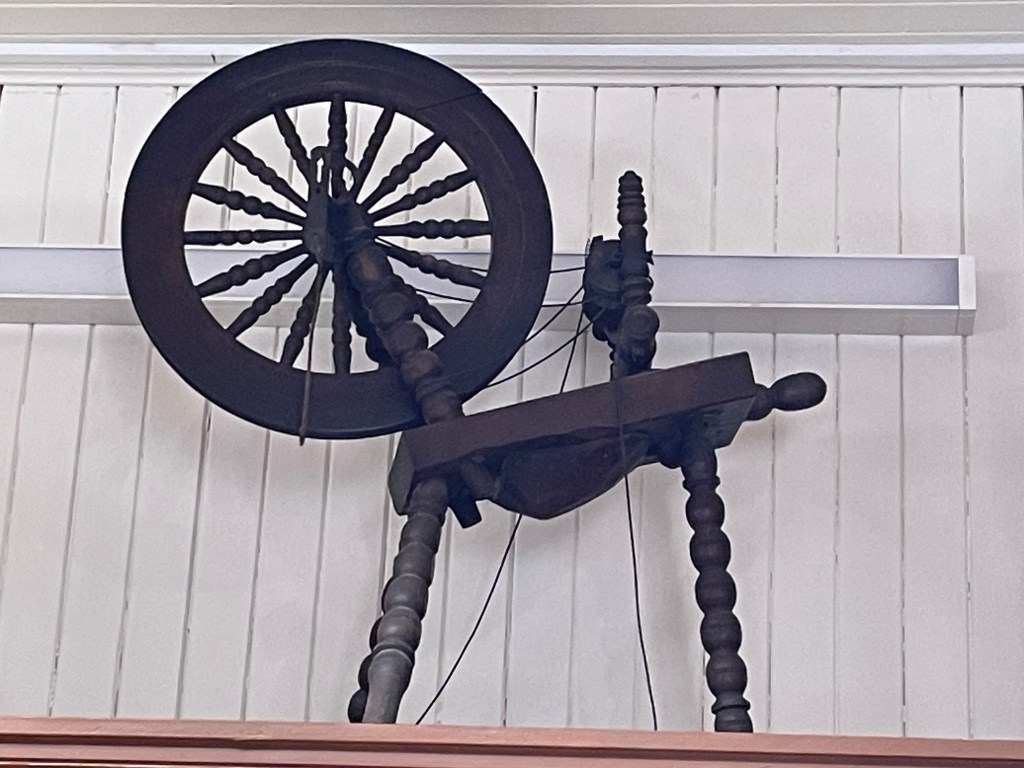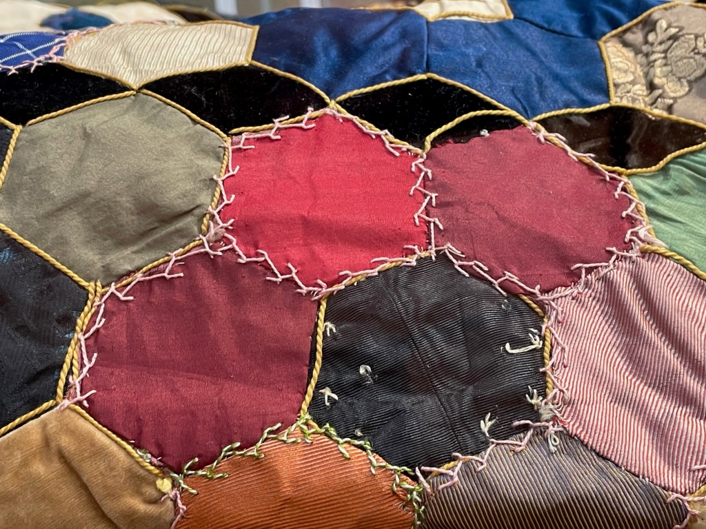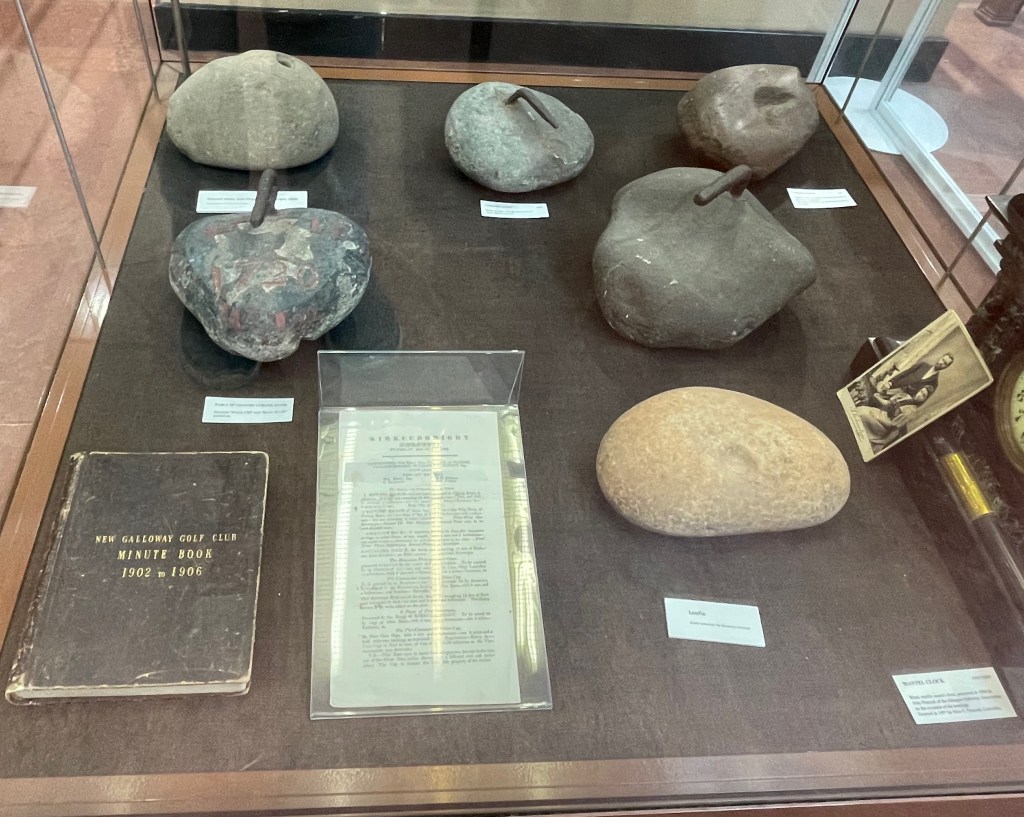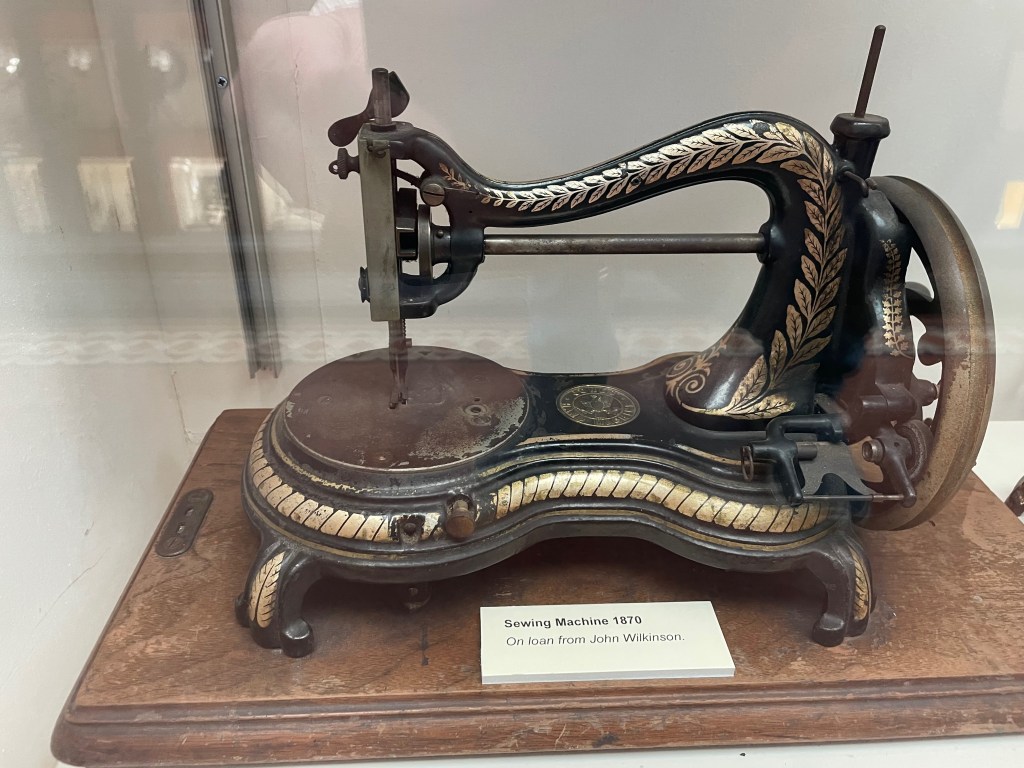 It is signed ‘made by B Muir 1881 aged 91’. Traditional paper pieced hexagons in a mixture of fabrics with a piece of hand made lace stitched onto the back. I’m sure every piece of fabric had a story to tell and the lace must have held a special significance to be added to the quilt. I would have loved to find out more about her. She shows that we should never stop doing things that we love and being creative. Below are some more items from the collection. I particularly liked all the different curling stones, and the collection of very early sewing machines.
