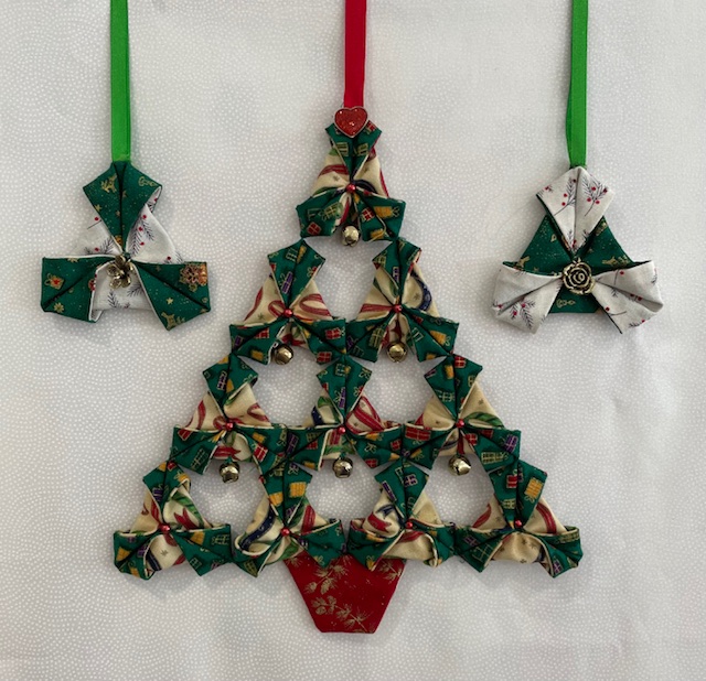 A kit to make three Christmas decorations. Two individual decorations for your tree and a larger tree shaped decoration. The kit includes precut fabric, ribbon, decorative notions, a fabric seam roller and seam guide and full instructions.